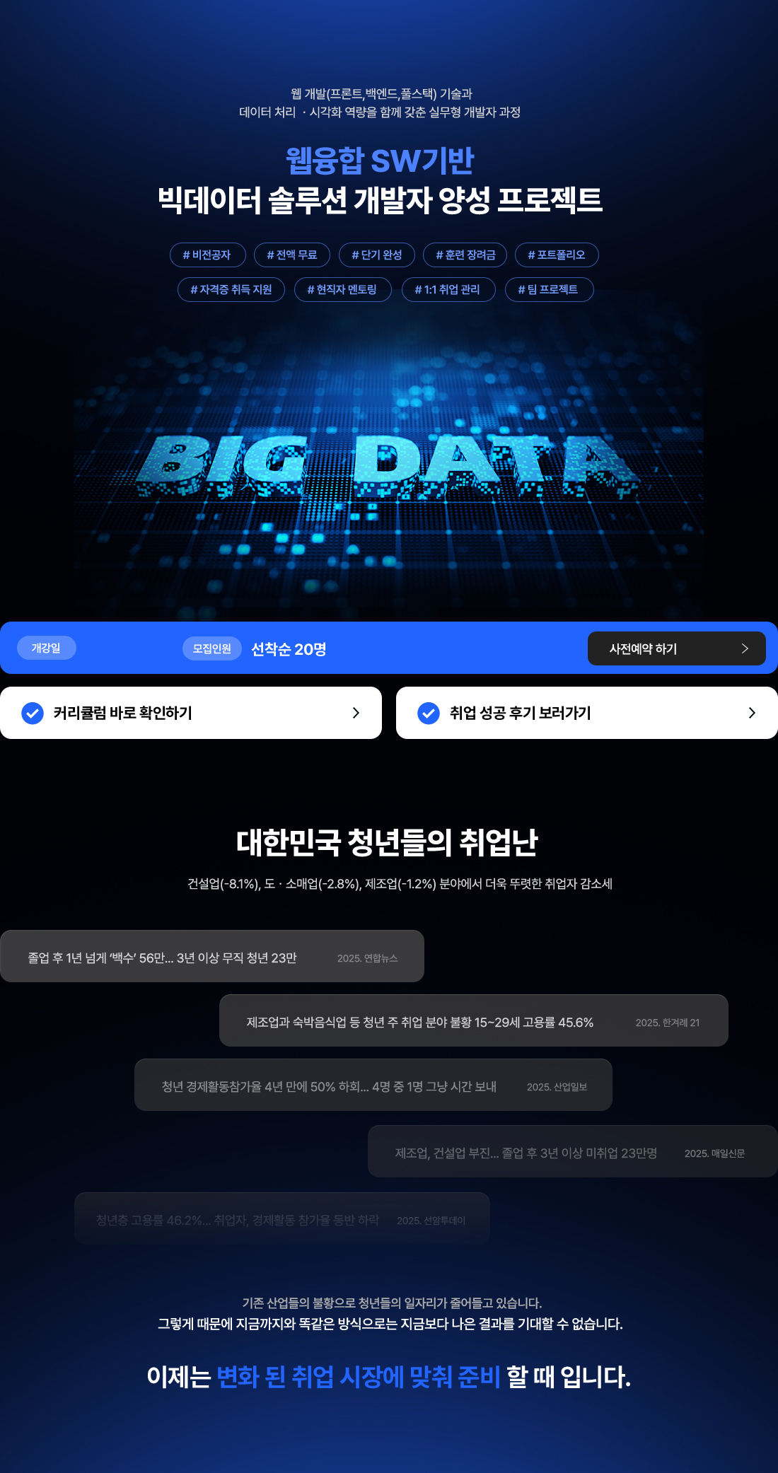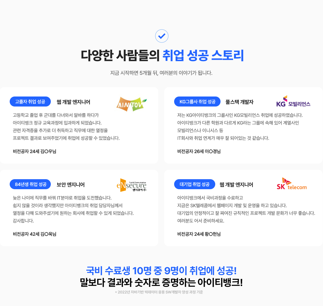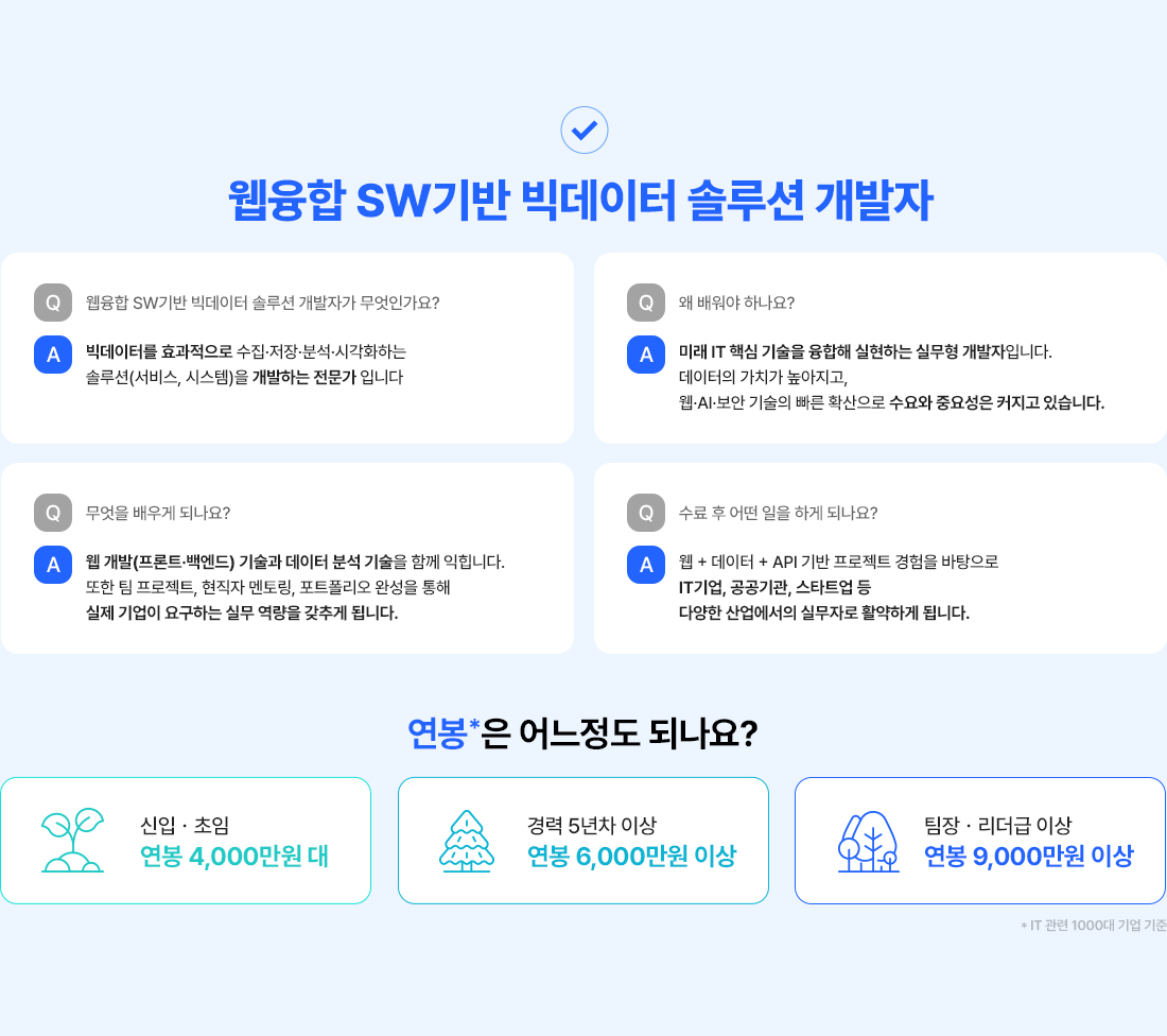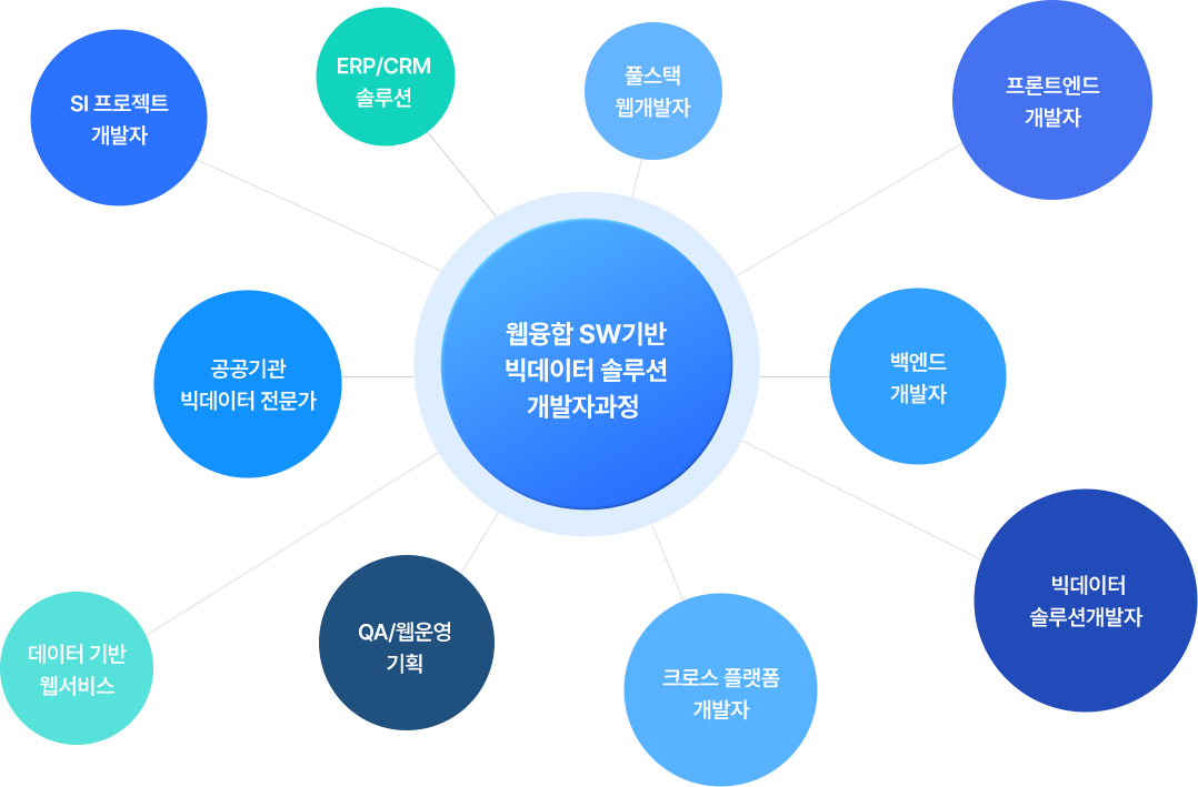 프론트엔드 개발자, 백엔드 개발자, 풀스택 웹개발자, 빅데이터 솔루션 개발자, 데이터 기반 웹서비스, 공공기관 빅데이터 전문가, SI프로젝트 개발자, ERP/CRM 솔루션, 크로스 플랫폼 개발자, QA/웹운영/기획자