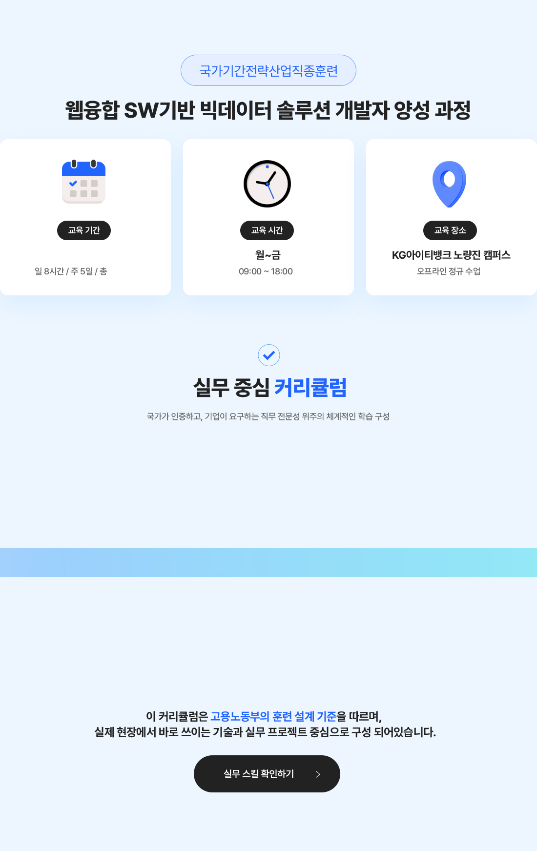 빅데이터 플랫폼 구축을 위한 프로그래밍 언어 활용, DB시스템 구축, 웹 융합 SW 개발 기술 등을 습득하여 빅데이터 솔루션 및 데이터 분석 기법을 활용한 SW전문가로 취업하는 과정